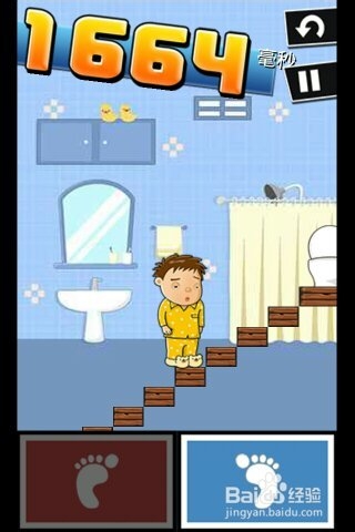 第四關“早晨沖向廁所”開始增加難度了,這一關要求我們不停的交替左右腳,用最快的速度沖向馬桶旁邊??此坪唵危乔f要算準了樓梯數量啊,沖多了就掉進水里失敗了……