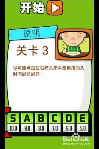 第3關,看到一個鼻涕男孩,有點意思,控制人物的頭,不要讓他掉下來,下面有左右的箭頭進行控制,過關基本要求是時間>;5.0 S。