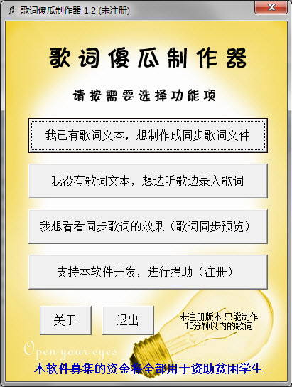 歌詞傻瓜制作器是一款綠色的歌詞制作器,無需注冊也可制作10分鐘以內(nèi)的歌詞文件,無使用次數(shù)、時間等限制。使用本軟件,您可以方便快速地制作歌詞文件。本軟件根據(jù)用戶的實際需要,對有無歌詞文本兩種情況進行設(shè)計,幫助用戶在最短的時間內(nèi)制作出LRC歌詞文件。全程向?qū)讲僮鳎唵我子?,綠色軟件,無需安裝,小巧方便。