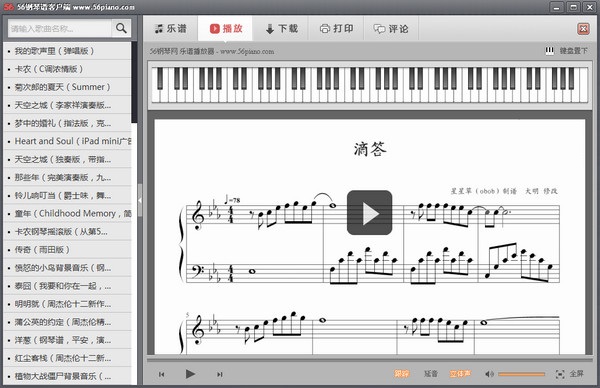56鋼琴譜客戶端包含2萬多首高清鋼琴譜,可播放、可打印、可下載!并且軟件是免費的。對于正在學(xué)習(xí)鋼琴的朋友們來說非常方便,選擇自已練習(xí)的曲子,可以播放正確的彈奏,然后自已再對著樂譜進行練習(xí)。