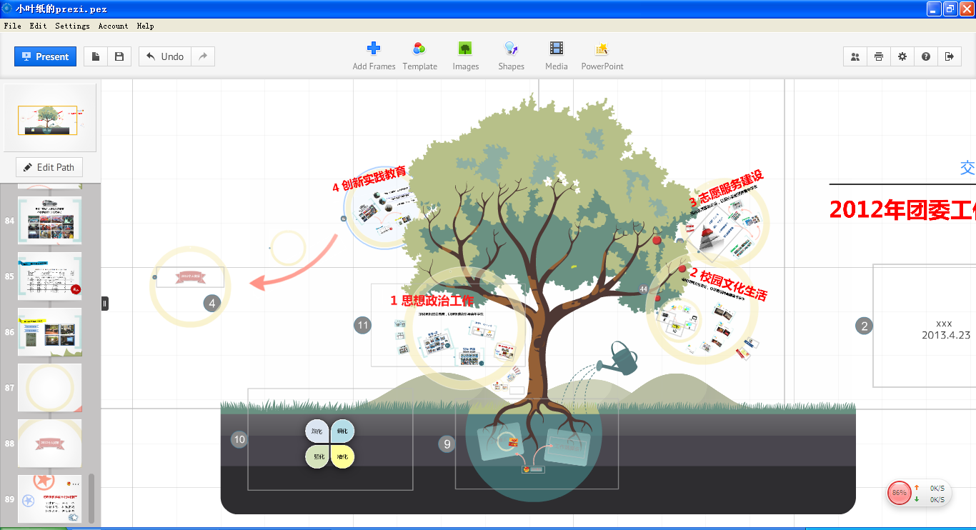 Prezi是一個(gè)非常牛逼的做presentation的軟件,相比較PPT這個(gè)有很炫酷的功能,而且很簡(jiǎn)潔,同時(shí)也避免了PPT在不同電腦不同格式之間的轉(zhuǎn)換帶來的效果變化等問題。prezi中文版下載是prezi的離線編輯軟件,可代替PPT,使用該軟件前需要登陸prezi的賬號(hào)(免費(fèi)賬號(hào)的使用期為30天)。附件里面包含了AdobeAir,Prezi,以及時(shí)間鎖定器(破解必備)還有就是中文語言包,安裝時(shí)候先安裝Adobeair,接著再是主程序,接著是語言包,最后是時(shí)間鎖定器.prezi是個(gè)云端的簡(jiǎn)報(bào)制作網(wǎng)站,讓使用者可以在 Prezi 網(wǎng)站上制作簡(jiǎn)報(bào),甚至與許多人一同編輯同一個(gè)檔案。