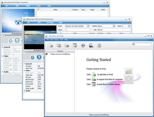 Joboshare iPod Mate它包括3個(gè)強(qiáng)有力的工具,視頻轉(zhuǎn)換,視頻處理,擷取。它也可以創(chuàng)建、編輯和刪除iPod視頻格式,播放和復(fù)制文件到別的多種音樂播放器里。也可以轉(zhuǎn)換多種視頻格式,例如WAV、WMV、MP2、AC3、RA、M4A、OGG、AAC到iPod audio MP3。