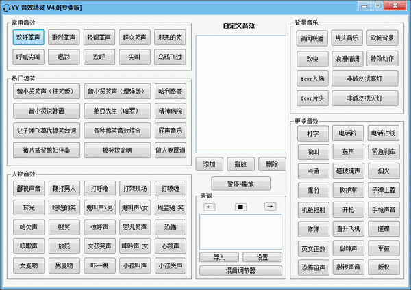 yy音效精靈是一款利于玩yy語音和is語音以及qqtalk語音的朋友的工具,軟件內(nèi)包括群眾笑聲,尖叫聲,掌聲,嬰兒笑聲,狗叫聲,打呼嚕,打噴嚏,烏鴉飛過等等各種音效。