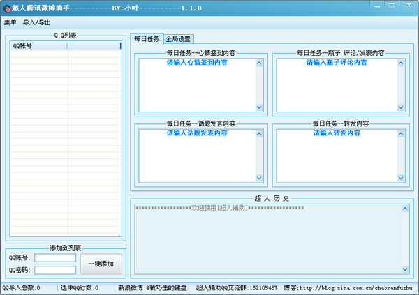 超人騰訊微博助手是一款精心制作的qq微博輔助,其頁(yè)面簡(jiǎn)潔,操作簡(jiǎn)單。有自動(dòng)任務(wù)、自動(dòng)發(fā)表話題、自動(dòng)轉(zhuǎn)發(fā)、評(píng)價(jià)、簽到等等功能,讓您微博粉絲增長(zhǎng)快人一步,歡迎下載使用。