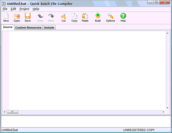New是新建,Open是打開(kāi)(現(xiàn)有批處理文件)。寫好批處理之后直接按下“Build”(創(chuàng)建)即可。此前可以點(diǎn)擊“Custom Resources”頁(yè)進(jìn)行自定義資源。注意,這個(gè)軟件支持最大128X128的大圖標(biāo),不錯(cuò)啊。“Include”頁(yè)可以設(shè)置程序中將要包含進(jìn)去的文件(這功能類似自解壓程序文件),打包之后的文件在程序運(yùn)行時(shí)會(huì)被釋放出來(lái)。注意:不要打包較大的文件進(jìn)去,否則程序啟動(dòng)速度會(huì)嚴(yán)重減慢。