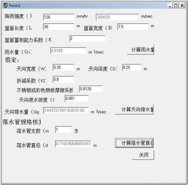 已知降雨強(qiáng)度,屋面長(zhǎng)度,屋面寬度,屋面蓄水能力系數(shù),計(jì)算雨水量;