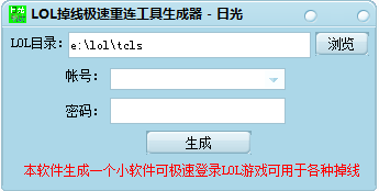 大家在玩英雄聯(lián)盟的時(shí)候,在開盒子時(shí),總是走幾秒就卡,每次重連都要打密碼非常麻煩,而且浪費(fèi)時(shí)間,正是由于這個(gè)原因,所以制作了lol掉線極速重連工具生成器,lol掉線重連器可以生成一個(gè)小軟件,可極速登錄lol游戲,可用于各種掉線。