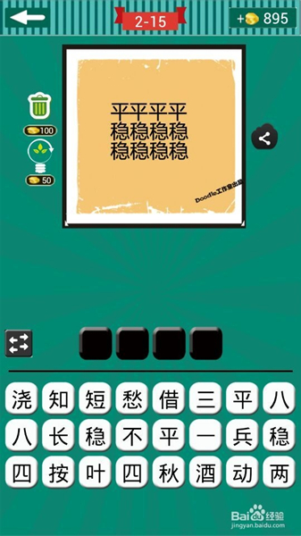 第四種看文字的數(shù)量,文字的數(shù)量與成語(yǔ)有關(guān),圖片中的“平”有四個(gè),“穩(wěn)”有八個(gè),顯然是四平八穩(wěn)。