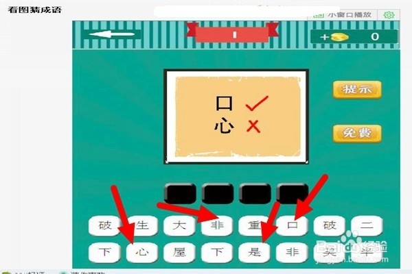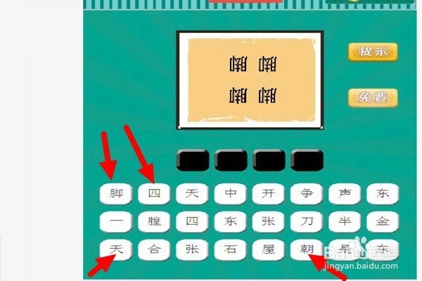 如果我們?cè)诓鲁烧Z(yǔ)填字的時(shí)候,填錯(cuò)了,我們可以用鼠標(biāo)的左鍵點(diǎn)擊圖中箭頭所指向的部位,重新做這一題。如果我們實(shí)在想不起來(lái)是什么成語(yǔ)的時(shí)候,我們可以點(diǎn)擊提示和免費(fèi)。