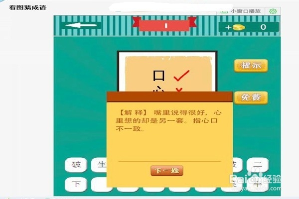在打開(kāi)看圖猜成語(yǔ)游戲后,會(huì)出現(xiàn)一個(gè)方框。在方框中會(huì)給我們一些關(guān)于我們所要猜的成語(yǔ)的提示,在下面這個(gè)方框中,在口的后面打勾,而在心的后面打×,我們可以理解為口是心非。我們?cè)谙旅娴倪x項(xiàng)中分別找到口、是、心、非幾個(gè)字,在用鼠標(biāo)的左鍵點(diǎn)擊后,這些字上面的黑色的小方塊中會(huì)依次出現(xiàn)我們所點(diǎn)擊的字。如果我們的答案正確,就會(huì)彈出一個(gè)方框,顯示對(duì)這個(gè)成語(yǔ)的解釋,我們?cè)邳c(diǎn)擊下一題后,就會(huì)進(jìn)入下一題。