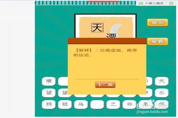 接下來(lái),又會(huì)出現(xiàn)一個(gè)方框。天字寫在一個(gè)正方形的方框中,而譚字的右上方有一個(gè)畫出的月亮。由此,我們可以推測(cè)這個(gè)成語(yǔ)是天方夜譚。在用鼠標(biāo)的左鍵依次點(diǎn)擊天、方、夜、譚后,這一題就完成了。