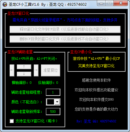 圣龍CF輔助準(zhǔn)星:調(diào)整好設(shè)置后,按Alt+6開啟,開啟時不能調(diào)整設(shè)置,按Alt+F7關(guān)閉,不閃屏,可支持圣龍CF窗口化。