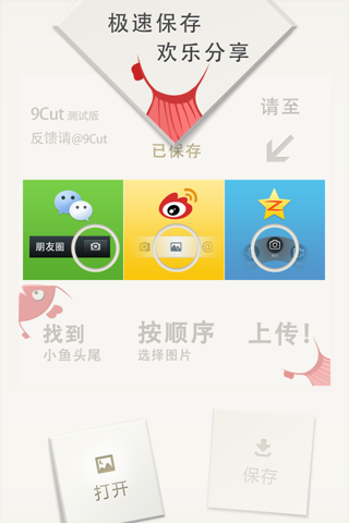 “從截圖看得出,這個(gè)app能幫我把1張大圖切成9張小圖,這樣我就能在微信朋友圈、新浪微博或QQ空間上上傳這9張小圖拼成1張9宮大圖啦!太棒了!”