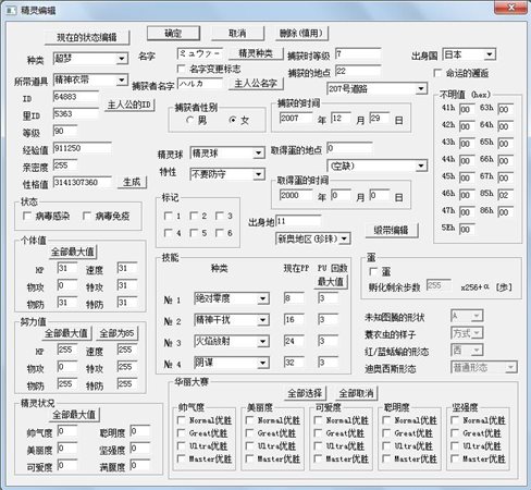 點編輯彈出對話框 種類可以自定義,所帶道具可以自定義.個體值可以在0-31之間自定義,努力值可以在0-255之間自定義,努力值全部255也可以,性格也可以自定義,只不過這3項修改好要點左上角的現(xiàn)在的狀態(tài)編輯中的標準值,如果忘記點標準值則必須吃1顆神奇糖果才能實現(xiàn)修改后的能力,如果直接拿去戰(zhàn)斗可能會發(fā)生錯誤.特性也可以自定義選,只不過進化后會變回來自身的2個特性之一,所以盡量修改最終進化型的特性.技能也可以自定義,就連未知圖騰的技能也可以隨便選4個,現(xiàn)在PP可在0-99之間自定義,如果超過了PP最大值,那么使用的時候只能減不能加直到現(xiàn)在PP=PP最大值-1,然后PU回數(shù)可在0-99之間自定義,而3-99全是上限提升60%,所以3就足夠了.不明值盡量不要去動.如果修改名字的話同樣可以使用日文名,英文名和符號,而半角最多可達8個,但是全角最多還是5個.如果精靈還是蛋的狀態(tài)那么修改努力值和經(jīng)驗值無效,孵化后名字是默認的,全體和性格是自己設(shè)置的,但是努力值是全0,等級是1.因為游戲的設(shè)定是孵化的精靈一律1級而且沒有努力值,包括瑪娜菲的蛋,如果嫌孵化步數(shù)太多可以降低步數(shù),個體太低或者性格自己不喜歡都可以修改.