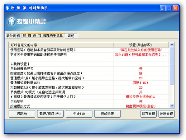全連P、全模式、太古模式、自動(dòng)開(kāi)始、穿墻、隱藏?zé)嵛枧申?duì)游戲、熱舞派隊(duì)多開(kāi)、反轉(zhuǎn)反鍵、支持舞廳休息區(qū)跳、名字帶有空格、自動(dòng)喇叭、支持全部分辨率、多開(kāi)掛機(jī)、自動(dòng)按空格、自動(dòng)按鍵、自動(dòng)斗氣、自動(dòng)反轉(zhuǎn)、自動(dòng)喂寶寶、自動(dòng)提取寶寶能量、自動(dòng)激活任務(wù)、自動(dòng)續(xù)多倍卡、掉線(xiàn)報(bào)警或關(guān)機(jī)等等功能。