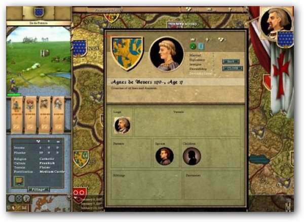作為領(lǐng)主,他們也有義務(wù)為自己成年的后代保證前途,也就是王子們必須有土地,公主們必須及時(shí)出嫁,否則將每月自動(dòng)產(chǎn)生威望下降。國王第一個(gè)沒有土地的兒子將令其本人威望每月下降0.3,第二個(gè)-0.2,以后的幾個(gè)均-0.1。公爵和伯爵們沒有土地的兒子每一個(gè)都將減少本人威望0.1。不出嫁的公主也同理類似,效果完全相對(duì)應(yīng)。