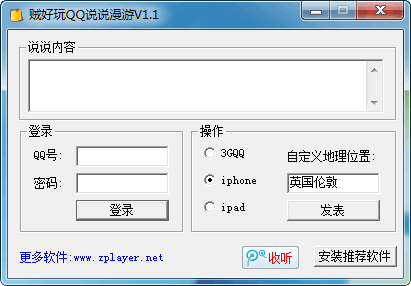 賊好玩qq說說漫游是一款騰訊qq空間說說的發(fā)布工具,通過賊好玩qq說說漫游軟件可以自定義qq空間說說顯示的地理位置。