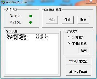 phpfind是7件套,集成最新nginx+php+mysql+sql-front+zend guard loader+xcache。phpFind下載支持系統(tǒng)服務和非服務兩種啟動方式,自由切換。一次性安裝無需再安裝,即使重做系統(tǒng)后亦可使用,直接點啟動即可。