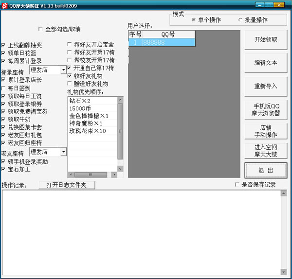 3、選擇表格中的QQ,勾選需要使用的功能,再單擊【開始領(lǐng)取】按鈕即可領(lǐng)取所選QQ的各種獎(jiǎng)勵(lì)。