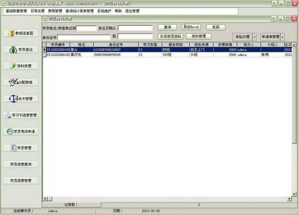 基礎資料(教練信息、員工信息、車輛信息、服務類型、學習車型)、流程管理(入學登記、資料受理、分配教練、學時卡管理、考試申請、一科約考、二科約考、三科約考、學員管理、退費、進度查詢、學員資料匯總表、綜合統(tǒng)計報表)、費用管理、報表中心等。集進學員管理、考試管理、證件管理、強大的報表功能:機動車駕駛人身體條件證明,機動車駕駛證申請表,受理表,學員分配單等報表的打印,支持從Excel導入教練信息、員工信息、車輛信息、服務類型、學習車型等信息。