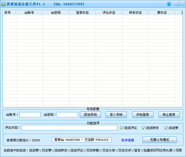 莫寒說說全能工具是專用于增長QQ空間說說人氣的實用工具,支持說說評論、說說轉(zhuǎn)發(fā)、說說贊等功能,支持無需小號模式,安全可靠,歡迎下載體驗。