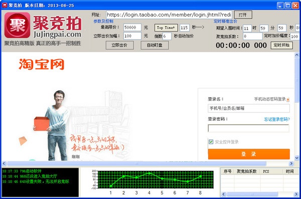 聚競拍通過精密的算法計算出客戶計算機和網絡的狀況,以系數為核心通過高精度精準出價,幫助商家競拍上聚劃算坑位的軟件。 軟件采用IE瀏覽器內核,從登錄到進入競拍大廳,從填寫價格到提交價格,每一個步驟都是通過IE瀏覽器完成,軟件通過操作瀏覽器上的按鈕進行出價,和手工操作無異,利用計算機的高速和精準的特性讓入圍時間變得可控。