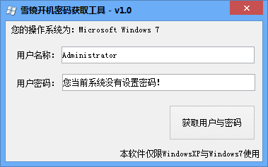 雪鏡開機(jī)密碼獲取工具是一款可以獲取windows xp及windows7系統(tǒng)的開機(jī)密碼以及用戶名的軟件,其他操作系統(tǒng)可能無(wú)法獲取。