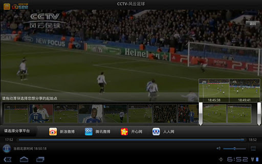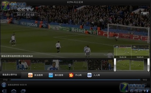 3、打點(diǎn)分享。用戶可以根據(jù)提供的已播節(jié)目截圖,拖拽滑塊,選擇視頻的出入點(diǎn),隨后即可選擇平臺,進(jìn)行分享。