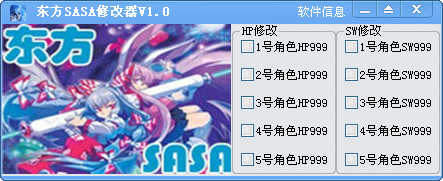 東方SASA修改器 v1.0 官方版 東方SASA修改器是同名游戲東方SASA的輔助工具,主要是對(duì)5個(gè)角色的hp ,sw進(jìn)行9999的數(shù)值的鎖定,讓你強(qiáng)大無(wú)比,幫助你順利完成游戲哦