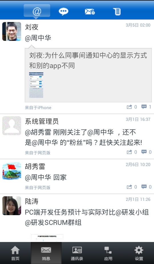 同事間是一款企業(yè)同事之間的協(xié)作分享應(yīng)用,個人可以通過發(fā)布消息的方式與網(wǎng)絡(luò)內(nèi)的同事分享觀點、文檔及圖片,隨時隨地協(xié)同溝通。同時擁有Web版本,使用企業(yè)郵箱注冊即可享用基本的溝通分享功能。