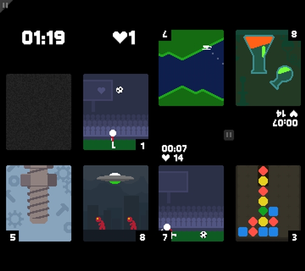 Mini Mix Mayhem是一款像素風(fēng)格的小游戲,這款游戲很有特色,它把數(shù)個(gè)小游戲同時(shí)集中在屏幕上,讓你同時(shí)玩四款游戲,每個(gè)小游戲有九秒的時(shí)間,玩家必須在這時(shí)間內(nèi)完成所有游戲的要求,不然就會(huì)損失一條命,共有10條命,看你能堅(jiān)持幾關(guān)呢。