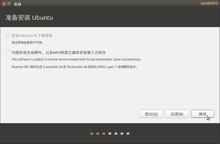2)第2步是檢查準備情況,要求磁盤空間足夠,最好連上網(wǎng)絡,一般不勾選更新和第三方軟件,點“繼續(xù)”按鈕;