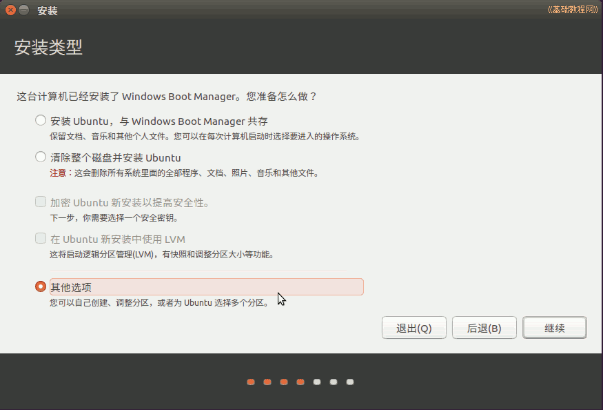 3)接下來第3步是詢問安裝到哪個分區(qū),選擇最下邊的“其他選項”,點“繼續(xù)”按鈕;