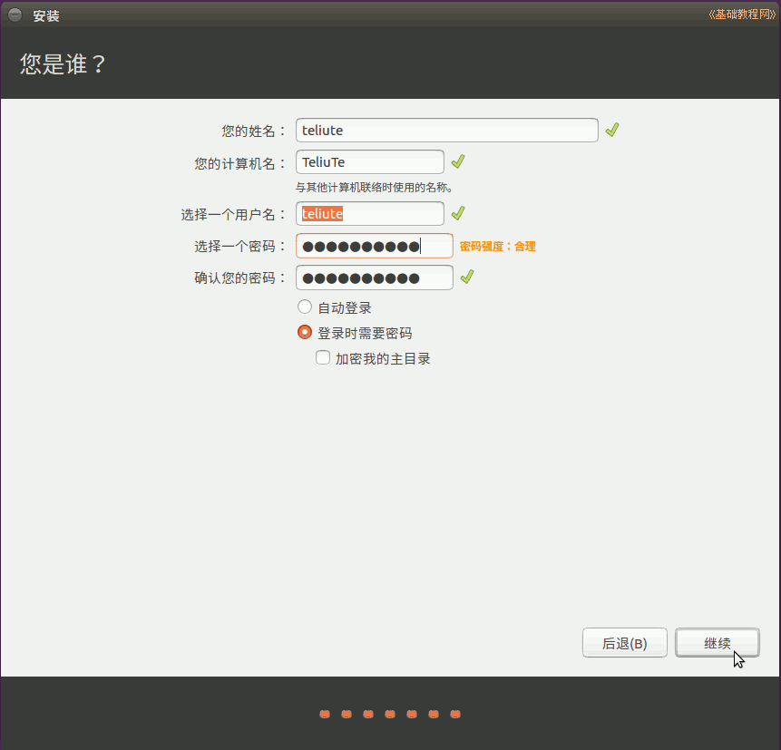 11)接下來是設定自己的用戶名(小寫字母)和密碼等,從上到下依次輸入即可,然后點“繼續(xù)”;
