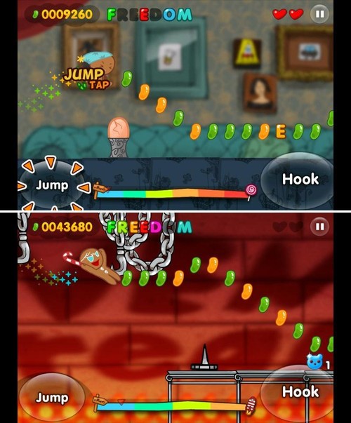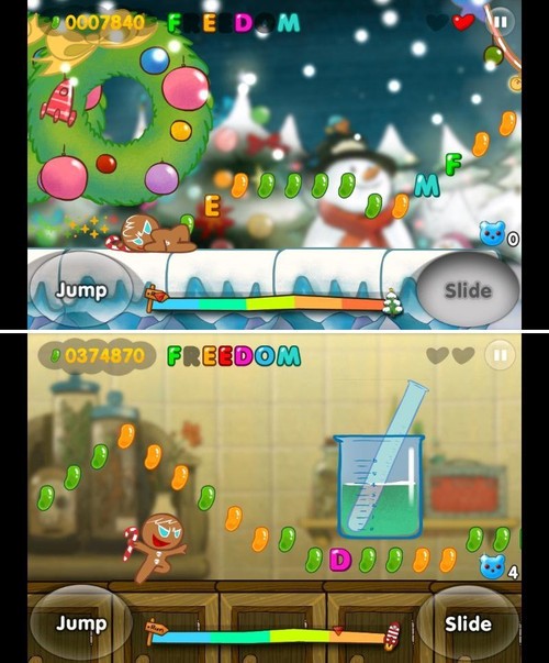 姜餅人大逃亡 OvenBreak的操作以屏幕下方左右兩側(cè)的虛擬按鈕為主,左邊為跳躍,右邊為滑行,而憑借物體的支撐,你也可以先按跳躍再按滑行實現(xiàn)蕩跳的效果。姜餅人大逃亡游戲過程中,你需要吃一路上的糖豆和字母,普通糖豆可增加得分,收集的字母組成“FREEDOM”便可獲得意外生命或分數(shù)獎勵,拾取特殊糖豆可一次獲得2000高分。
