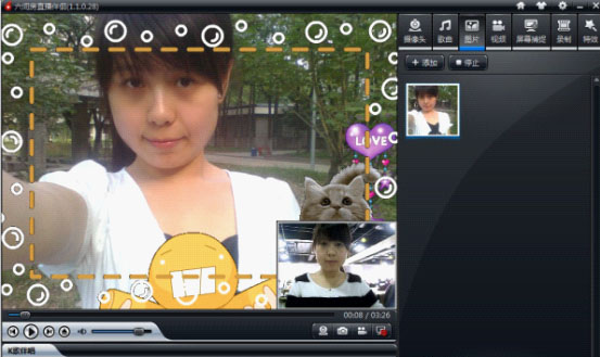 六間房視頻伴侶擁有兩個(gè)主題背景:黑色炫動(dòng)和清新藍(lán)色,如果用戶對(duì)此略感單調(diào),還可以在圖片添加自己喜歡的圖片作為背景畫面,實(shí)現(xiàn)自定義美化屬于自己的個(gè)性視頻直播內(nèi)容。
