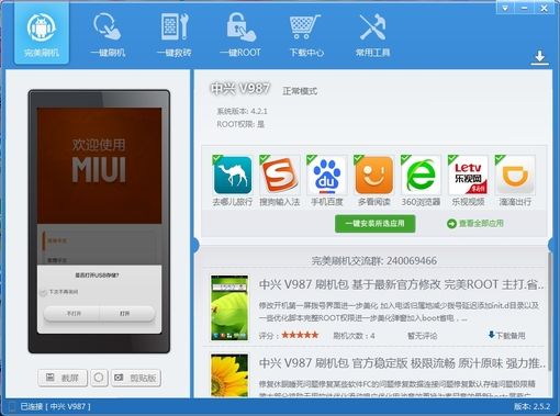 1.打開完美刷機,手機打開USB調試并用數(shù)據(jù)線連接電腦,如果不會打開USB調試設置,可以參考軟件首頁的教程提示。