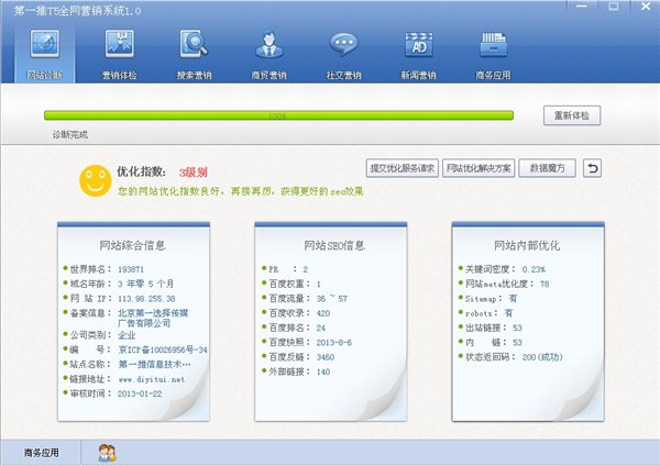 第一推T5全網(wǎng)營銷系統(tǒng),是由深圳市第一推信息技術(shù)有限公司花巨資打造的國內(nèi)第一家開放平臺模式的全網(wǎng)營銷系統(tǒng), 它打破了傳統(tǒng)營銷軟件的服務模式、顛覆了傳統(tǒng)互聯(lián)網(wǎng)企業(yè)的思維模式、開創(chuàng)了"智能系統(tǒng)+ 頂級資源+專家指導+商務應用"四位一體的新一代營銷模式,將專業(yè)而復雜的網(wǎng)絡(luò)營銷策劃 執(zhí)行工作以及優(yōu)質(zhì)而稀有的互聯(lián)網(wǎng)資源轉(zhuǎn)化為標準化、平臺化、集成化的網(wǎng)絡(luò)營銷系統(tǒng),為 企業(yè)提供低成本、高績效、全覆蓋、優(yōu)轉(zhuǎn)化的全網(wǎng)營銷品牌服務