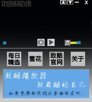 致酷播放器 v1.1 綠色免費版 致酷播放器由致酷網(wǎng)開發(fā)并發(fā)布的一款簡潔炫酷的音樂播放器,雖然界面小巧卻非常強(qiáng)勁。更有飄雪桌面動畫,讓你在享受音樂的同時不再單調(diào)。