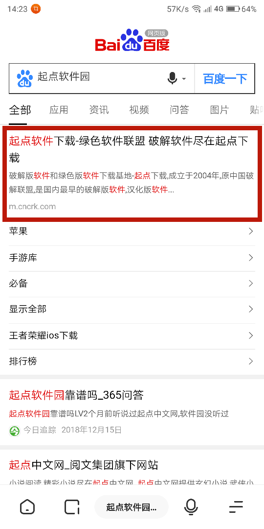 1.打開瀏覽器,百度搜索起點軟件園,選擇第一個進(jìn)入