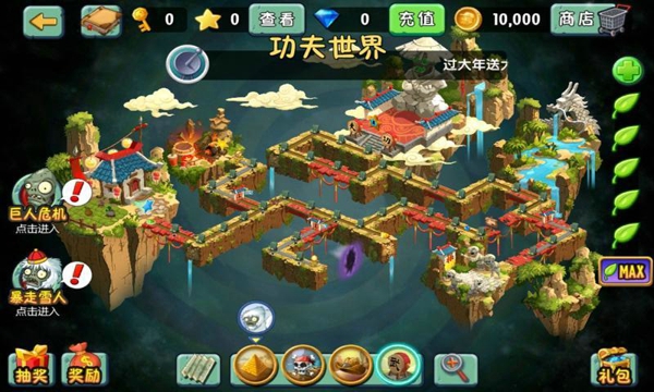 在故事方面,游戲也不再采用前作中的線性流程,而是讓玩家隨意在地圖上移動,除了主線關(guān)卡外還存在不少分支,這些分支關(guān)卡需要玩家湊齊鑰匙/星星才能進(jìn)入,成功通過支線關(guān)卡能獲得一些額外的獎勵,除了全新的植物外,還有各類升級獎勵,例如更多的卡片槽、初始陽光和小推車,這些獎勵能在地圖上隨時查看,十分方便。