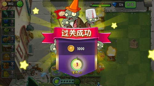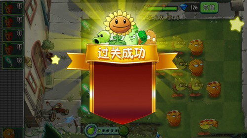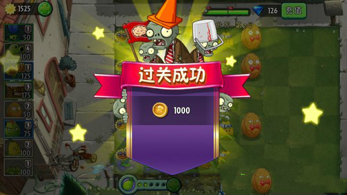 當(dāng)一大波僵尸來襲的時候,玩家們可以給植物能量豆,這樣就能快速消滅僵尸啦。由此摩登世界第一日通關(guān),如圖:
