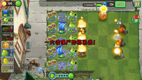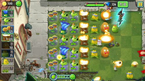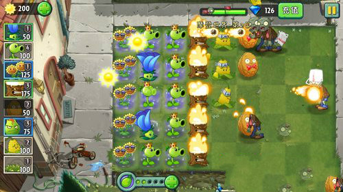 然后是豌豆射手+火炬樹樁,玩家們也可以盡可能選擇多的豌豆射手,再搭配上一行的火炬樹樁,攻擊力增強(qiáng)。還有前排記得配合上玉米投手,能夠延緩僵尸進(jìn)攻速度。