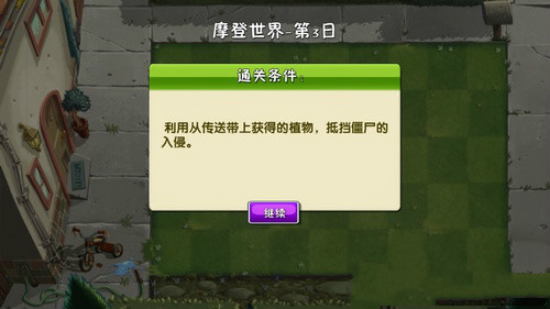 摩登世界第3日過關(guān)條件:利用從傳送帶上獲得的植物,抵擋僵尸的入侵。
