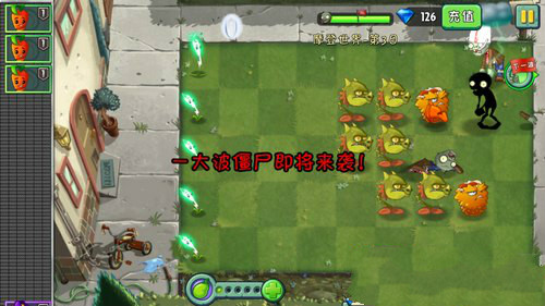 這個關(guān)卡會有四階僵尸出現(xiàn),所以玩家們盡可能選擇好的植物。小編這邊選擇豌豆射手+火炬樹樁。當(dāng)然這不足以對付僵尸,我們還要帶上堅果,抵擋僵尸,必要時還可以用巖漿番石榴救急!