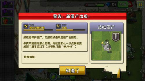 值得一提的是游戲中出現(xiàn)了新僵尸,那就是報紙僵尸。報紙能夠保護(hù)僵尸,而報紙被擊毀后僵尸會暴怒,玩家們可要小心咯。
