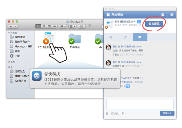 1. 夠快團(tuán)隊(duì)版用戶的“個(gè)人的文件”和“團(tuán)隊(duì)的文件”在本地實(shí)現(xiàn)了獨(dú)立管理。2. 桌面客戶端的側(cè)邊欄不再是windows用戶的專有功能了,Mac用戶在finder下能直接調(diào)用夠快功能強(qiáng)大的側(cè)邊欄,進(jìn)行文件的共享、討論和鏈接功能等相關(guān)操作。由于Mac操作系統(tǒng)自身的特性,側(cè)邊欄無法像windows版那樣完全依附在資源管理器中。