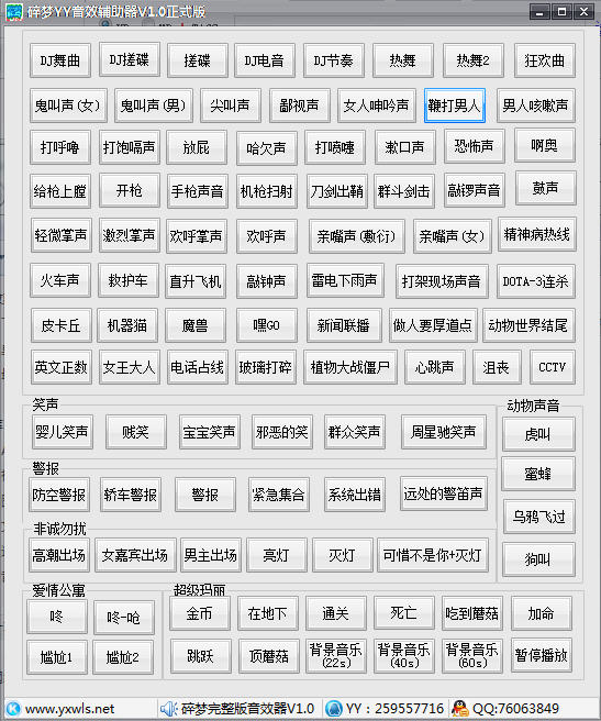 碎夢YY音效輔助器是一款專用的yy主持音效軟件。 提供笑聲、非誠勿擾、愛情公寓、超級瑪麗、動物聲音等常用音效使用,碎夢音效器在歪歪、QT、呱呱等語音聊天室唱歌時,你是不是想活躍氣氛但是不知道怎么活躍?現(xiàn)在這款音效器可以給你多種氣氛!