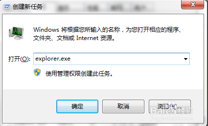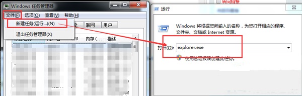 3.(不能完全修復(fù)應(yīng)該也沒問題),再 Ctrl + Alt + Del 開任務(wù)管理器應(yīng)該就能開出來了。再在任務(wù)管理器中應(yīng)用程序下的空白處右鍵,新建任務(wù)(運(yùn)行...),輸入explorer.exe確認(rèn),這樣原來的桌面包括圖標(biāo),開始欄等就出來了。