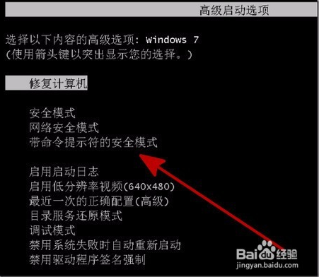 在登入模式中選擇【帶命令提示符的安全模式】;